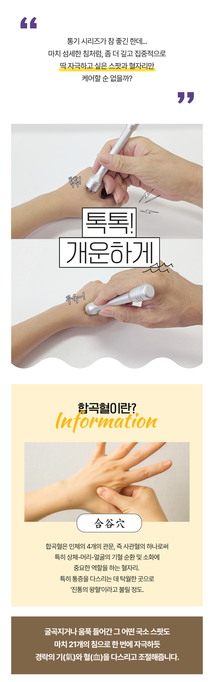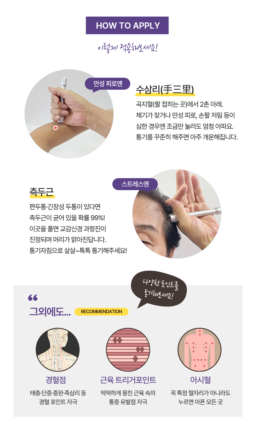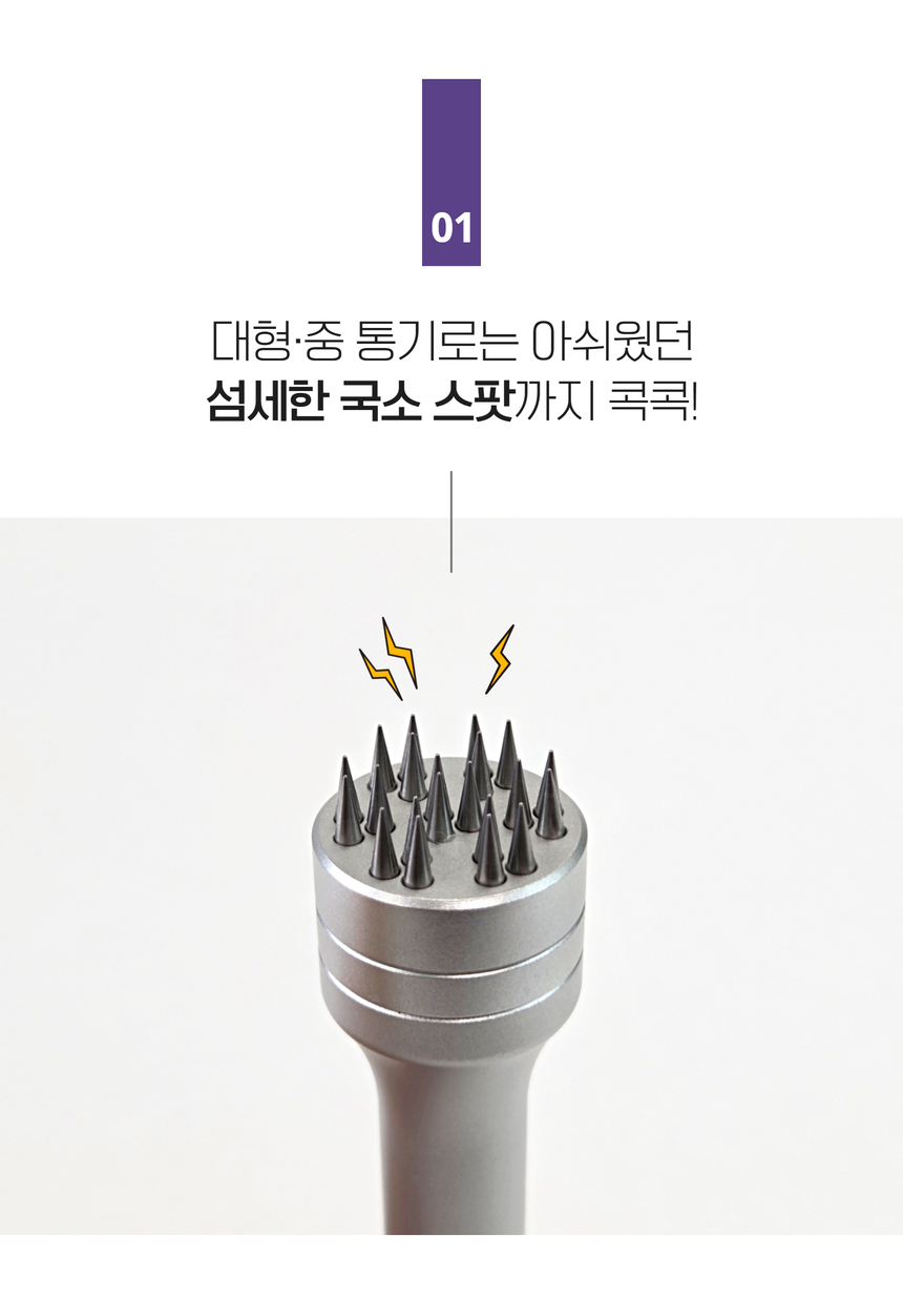 섬세하게 다뤄야 하는 얼굴, 유양돌기, 두피를 비롯한 각종 경혈점을 부드럽게 콕콕 자극하는 컴팩트한 휴대용 통기 마사지기